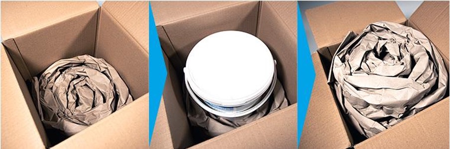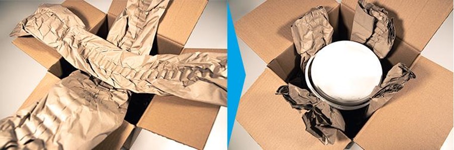 Simply place two crisscrossed paper cushions over the box and push your product down, assuring it is tightly secure against the sides of the box. The excess paper should cover and protect the top of the product. Before sealing the package, ensure that the item is not moving.