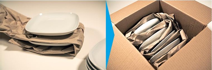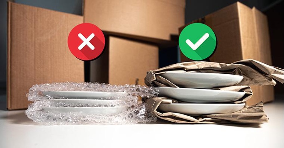 Simply replace the expensive bubble wrap, and use a long strip of 100% recycled paper cushioning, folding it over the item. Place the next item on top and secure it with more cushioning. You should create a zigzag effect with the strip, always making sure that you have enough paper to cover the top of the last item, avoiding excess.
