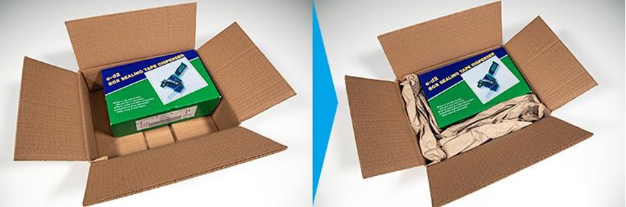 The whole point of void-filling is to guarantee that the items inside the package don’t move during transportation. This simple yet necessary technique requires that you pad all the spaces with enough paper, creating enough resistance so that items stand still.